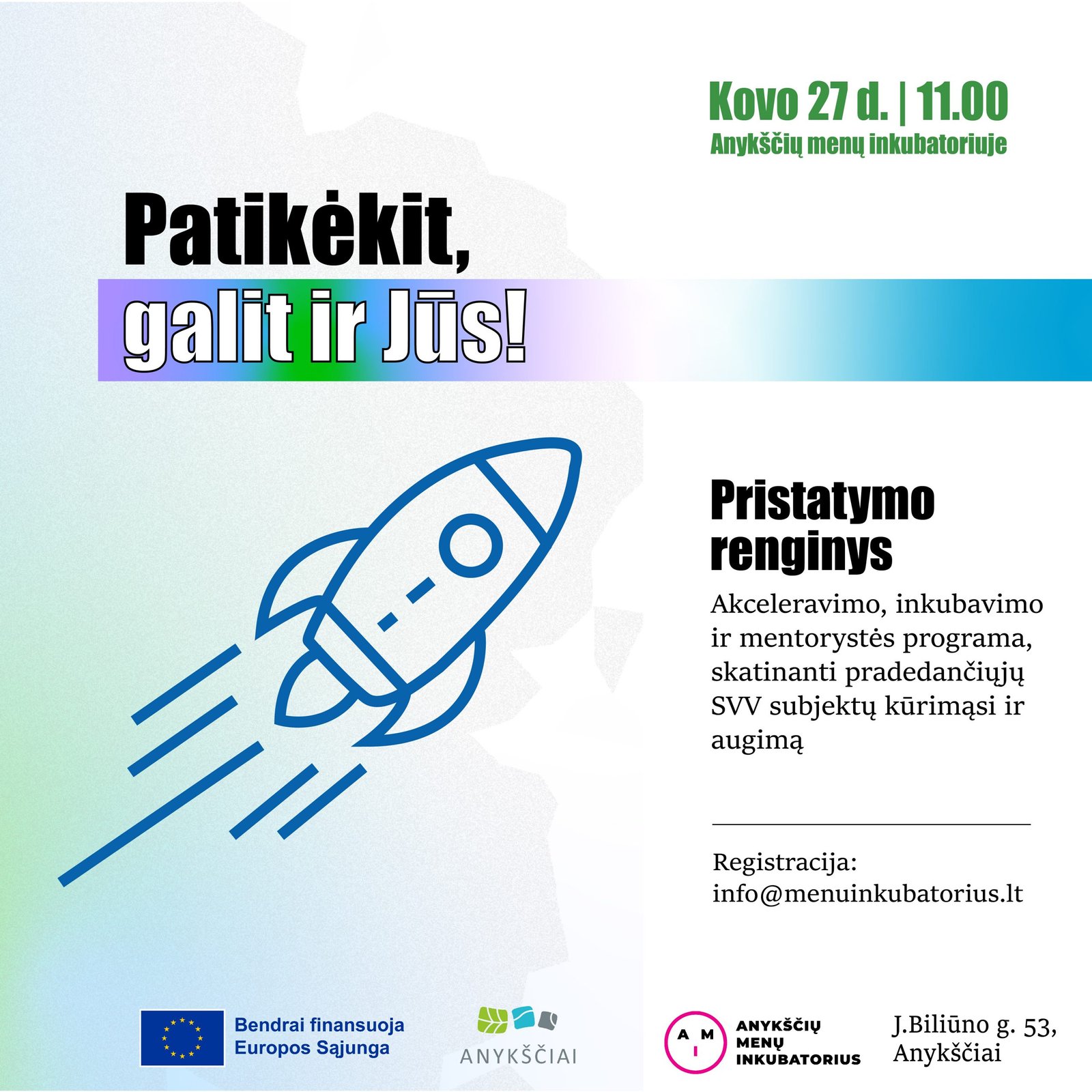 Projektas „VšĮ Anykščių menų inkubatoriaus – menų studijos akceleravimo, inkubavimo ir mentorystės programa, skatinanti pradedančiųjų SVV subjektų kūrimąsi ir augimą“