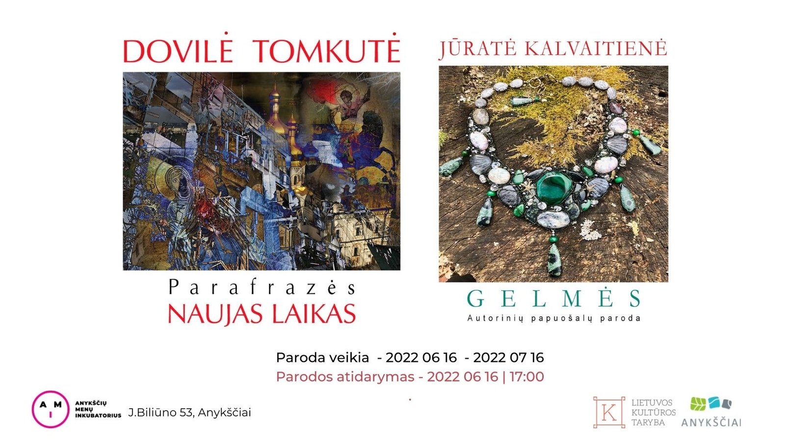 Dovilės Tomkutės grafikos paroda „Parafrazės/Naujas laikas“ ir Jūratės Kalvaitienės papuošalų paroda „Gelmės“