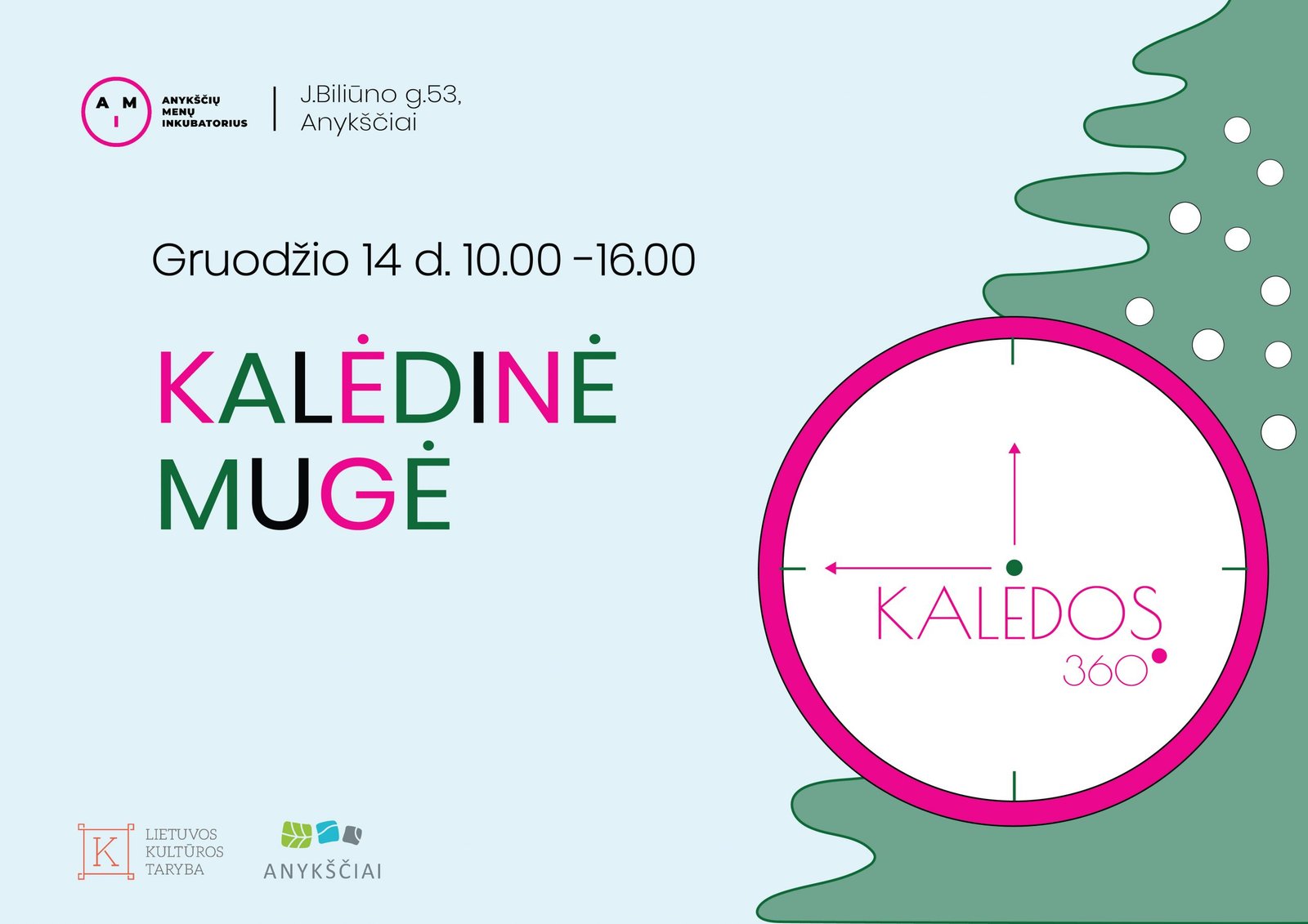 Anykščių menų inkubatoriaus organizuojama Kalėdinė mugė – vieta, kurioje pristatomi kūrėjų bei amatininkų darbai. Mugėje rasite originalių autorinių darbų, meno kūrinių, savos kūrybos, rankų darbo gaminių, galėsite dalyvauti šventinėse kūrybinėse dirbtuvėse, degustuoti skanėstus, pasisemti šventinės nuotaikos ir gerai praleisti laiką!