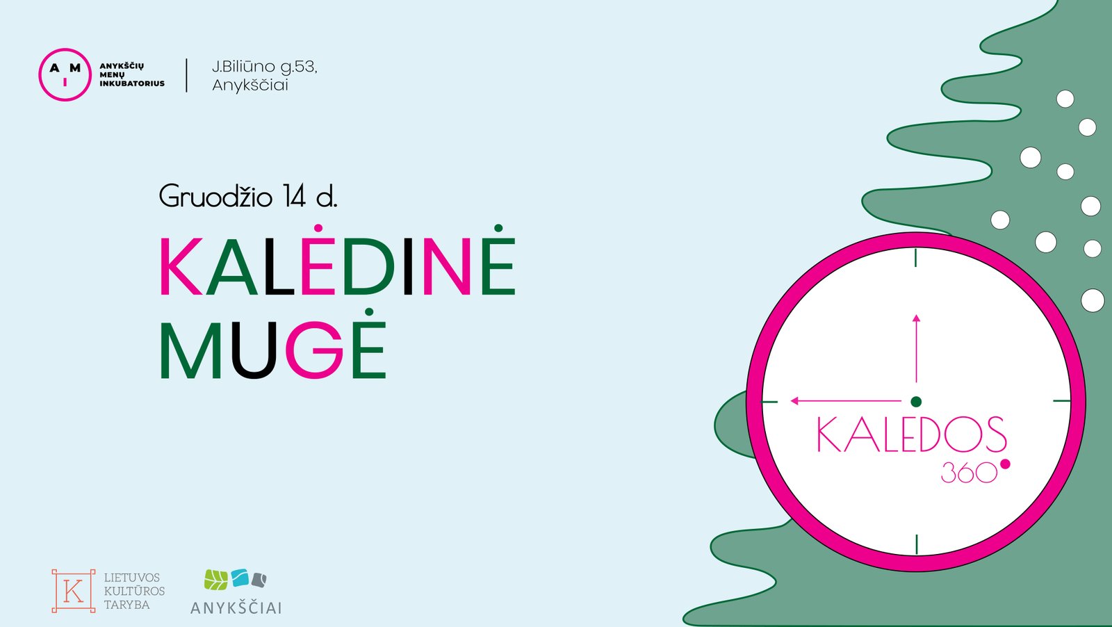 Anykščių menų inkubatoriaus organizuojama Kalėdinė mugė – vieta, kurioje pristatomi kūrėjų bei amatininkų darbai. „KALĖDOS 360°“ – tai daugiau nei mugė. Tai pilnas šventinis potyris, kuris užpildys dieną įspūdžiais, idėjomis ir įkvėpimu. Mugės metu kviesime lankytojus apsupti save šventine energija, pajausti nepamirštamą Kalėdų atmosferą ir patirti džiaugsmą visais 360 laipsnių!